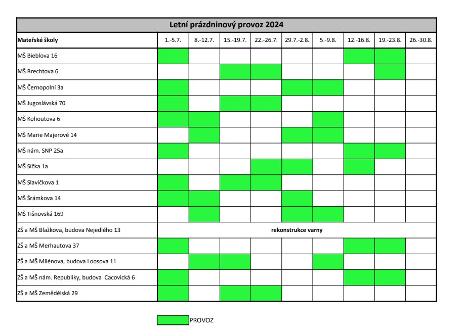 Naše školka bude mít provoz: 8. - 12. 7. a 29. 7. - 9. 8. 2024
